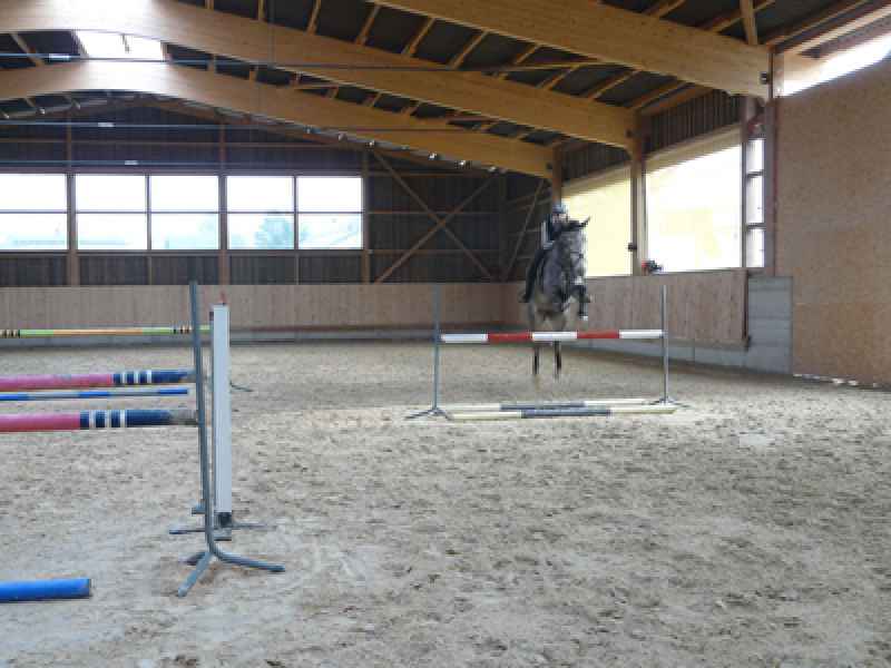 Le manège est très clair et aéré. Il est équipé de stores coupe-vent qui peuvent être relevés dès que le temps le permet, ce qui permet un maximum de fraîcheur en été. Le sol en sable de silice nous donne entière satisfaction.